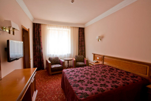 Делюкс: однокомнатный двухместный номер расположен в основном корпусе, укомплектован двухспальной кроватью, диваном и креслами. В номере необходимый комплект мебели, телевизор, телефон, мини-бар, кондиционер, сейф, фен, ванная комната с душевой кабиной. Гостям предоставляются халаты и тапочки.